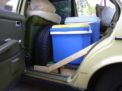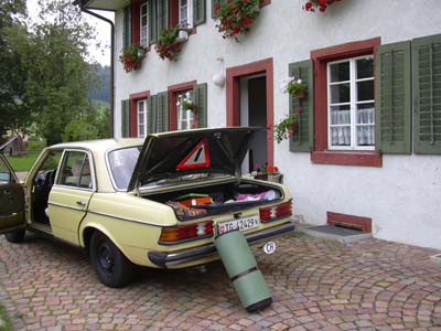 Das Büro verlies ich am Mittwoch wohl gegen 16:00 Uhr, um die letzten Ausrüstungsgegenstände zu laden. In meinen beiden Kühlboxen, deren Platz hinter dem Fahrersitz war, wurden die Lebensmittel verstaut. Nicht zu kühlende Ware (ca. 2 kg Teigwaren, Knödel im Kochbeutel, Mehl, Gewürze, Tomatenmark usw) wanderten in die kleine Box bis deren Deckel nur noch mit Mühe daraufpasste. In die grosse aktive Kühlbox kamen die zu kühlende Lebensmittel (Tiefgefrohrene Maultaschen, gefrohrenes Fleisch, etwas Milch, Wurst, Käse).Wenigstens die ersten Tagen sollten ohne Einkäufe zu schaffen sein. Meine beiden Wasserkanisten (je 5 Liter) stellte ich in den Kofferraum. Ziel war es, alles was schwer ist, z.B. der 20 Liter Reservekanister oder die 5 kg Gasflasche, möglichst nahe an die Hinterachse zu bringen, damit sich die Last besser auf beide Achsen verteilt. Weil sich dennoch der Kofferraum immer weiter absenkte, entschloss ich mich mein Werkzeug aus der Ersatzradmulde zu nehmen und es dafür im Fussraum auf der Beifahrerseite zu verstauen. Beim Packen zeigten sich zwei Mörtelkübel als vorteilhaft. Der eine diente als "Küchenschrank", der zweite als Kleiderkoffer. Die Kübel haben den Vorteil, dass sobald man den Kofferraumdeckel öffnet, man schnell auf die entsprechende Sachen zugreifen kann. Ein weiterer Vorteil gegenüber der losen Zuladung ist, dass alles kompakt gepackt ist, sodass man es auch schnell am Stück aus dem Kofferraum nehmen kann.