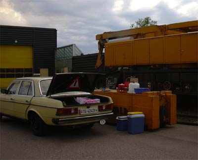 Abendessen auf dem Güterbahnhof in Kopenhagen. Das Balastgewicht des riesigen Kranen diente als Theke.