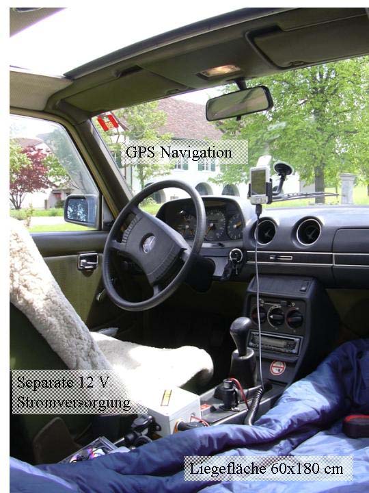Nach der erfolgreichen Swiss_Tour_2005 fiel die Entscheidung, im Jahr 2006 eine ausgibigere Tour zu machen. Doch wohin soll die Reise gehen bzw. fahren? Irgendwann wurde das Ziel gesetzt den 200D bis an den Rand von Europa bzw. bis an den Kartenrand des GPS zu fahren. Das Kartenmaterial des GPS ist für ganz Westeuropa ausgelegt und das sollte man doch auch mal nutzen ;-). Doch wo ist der Rand genau? Nach etwas "googlen" und wochenlangen Grübeln wurde zwischen dem südlichsten, westlichsten und nördlichsten Punkt Europas, welche man mit dem Auto erreichen kann, entschieden. Da der östlichste Punkt in Russland liegt und man für die Fahrt ein Visum braucht wurde er von Anfang an verworfen. Der südlichste und westlichsten Punkt liegen nahe zusammen. Um zu ihnen zu gelangen, muss man Spanien und Portugal durchqueren. Da diese Länder im Sommer sehr heiss sind und ich die Hitze ungern habe, fiel letztenendlich die Entscheidung auf den nördlichsten Punkt das Nordkap in Norwegen. Erste Schätzung, dank Routenplaner, liesen vermuten dass die Fahrt dort hin und zurück ca. 8000 km bedeuten, sofern man nicht die kürzeste Strecke wählt. Aber man will ja auch etwas von der Gegend sehen, in welcher man ist, daher ist der kürzeste Weg auch nicht immer der interessanteste. Unterstellt man eine tägliche Reisestrecke von ca. 400 km wird schnell klar, dass man sich für die Reise mindestens drei Wochen Zeit nehmen sollte. Und somit war auch schnell klar, dass man so ein Vorhaben nicht einfach mal schnell macht, sondern dass es einiges an Vorbereitungen benötigt. Einerseits musste die Arbeit so organisiert werden, dass man mal für drei Wochen von der Firma entbeerlich ist. Dies schien lösbar zu sein. Dann musste der Brummi-Diesel etwas gründlicher als sonst gewartetet werden, um sicher zu stellen, dass man diese Strecke ohne Reparaturen übersteht. Nichts wäre schlimmer als kostbare Zeit irgendwo in Skandinavien zu verbringen, nur weil man auf ein Erstatzteil eines 27 jährigen W123 warten muss! Und schliesslich sollte der 200D für Wochen mein Zuhause sein, also sollte man nicht nur gemütlich damit fahren können sondern auch gut darin schlafen können. Es könnte ja sein, dass man mal keine Lust hat das Zelt im Regen aufzubauen oder gar einen Campingplatz zu suchen. Aus diesem Grund habe ich übergangsweise den Beifahrersitz und die Rückbank entfernt und die frei gewordenen Platz durch ein Bett und Stauraum ersetzt.